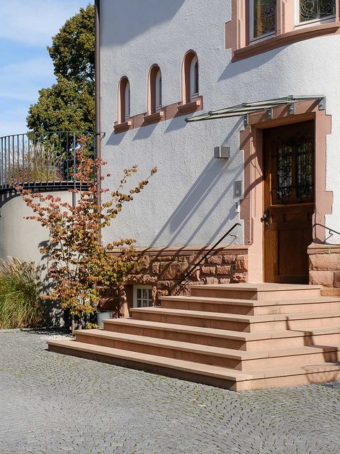Die Fassadengestaltung orientiert sich am historischen Erscheinungsbild: Sprossenfenster, Sandsteingewände und eine Schiefereindeckung rekonstruieren die klassische Architektur und unterstreichen den Charakter des Hauses.