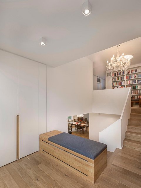 Ein wesentlicher Bestandteil der Umgestaltung war die Erschließung. Der ursprünglich seitlich gelegene Eingang im Souterrain wurde zur Straßenseite verlegt, wodurch auf dem ehemaligen Zwischenpodest der Treppe ein einladender Eingangsbereich entstand. Der neue Luftraum öffnet den Blick zur Galerie.