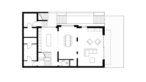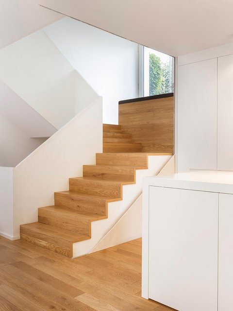 Über die Treppe gelangt man einerseits in die Privaträume im Obergeschoss und andererseits in das neue Zentrum des Hauses: die großzügige Wohnküche, die sich zum Wohnbereich hin öffnet. Diese Raumaufteilung wurde durch die Verlegung des Eingangs ermöglicht.