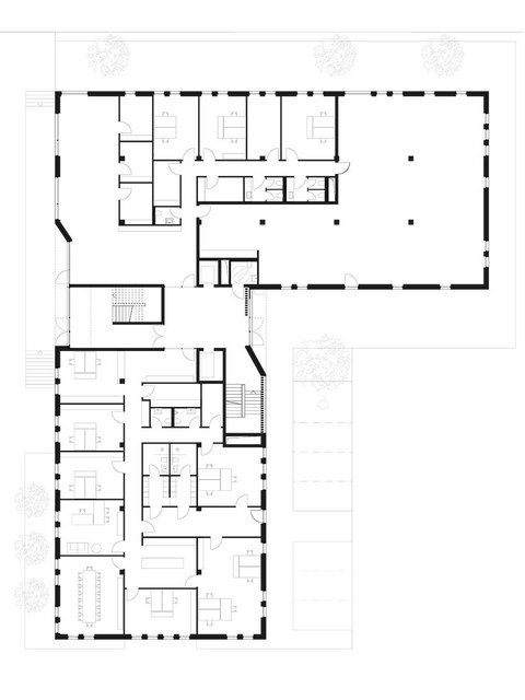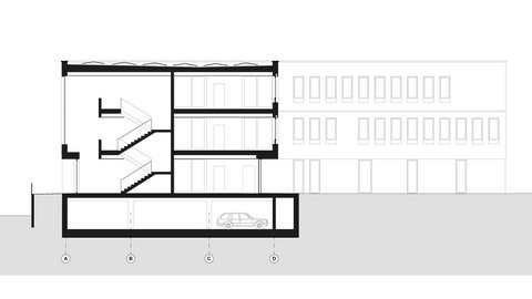 Zwei rechtwinklig zueinander angeordnete Baukörper bilden ein Ensemble, das sich zur Lahnstraße hin mit einer begrünten Freifläche und Stellplätzen öffnet. Der Wechsel zwischen schlanke Fensteröffnungen und großformatigen Verglasungen sturkturiert die Fassade und trägt zur klaren Erscheinung des Gebäudes bei.
