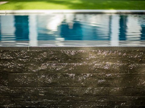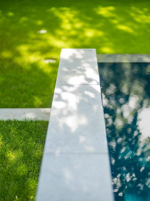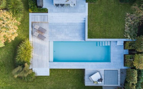 Der vorhandene Höhenunterschied im hinteren Garten wird in drei Terrassen gestaffelt – so entstehen drei eigenständige Räume: Die Hauptterrasse, der Gartenbalkon mit Pool und der versunkene Rhododendrongarten.