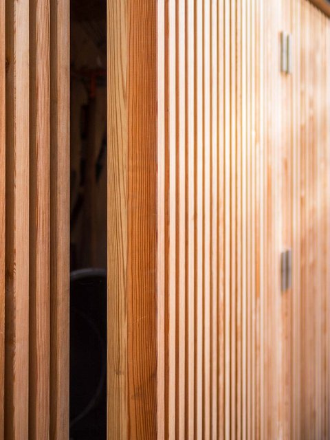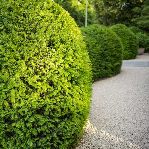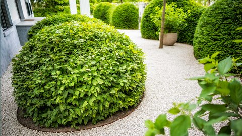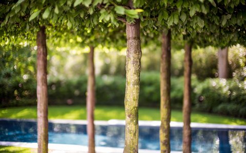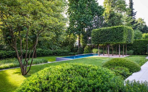 Freigeformte, hohe Taxuswolken inszenieren die Stringenz des Gebäudes in der Frontalansicht. Zwei asymmetrisch angeordnete weidenblättrige Eichen führen die Architektur über in ein Bild von Landschaft. Hohe Hecken und ein lockerer Rhythmus von hohen Säulenbäumen an der Grenze geben dem Garten Intimität und Geborgenheit.