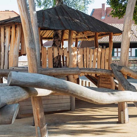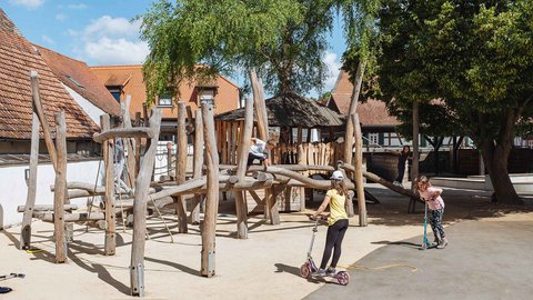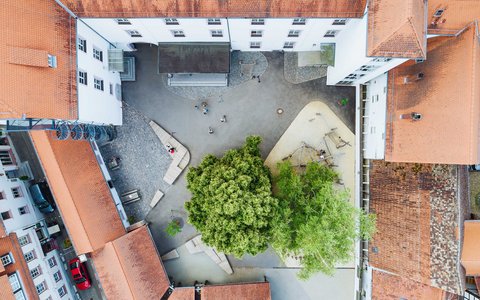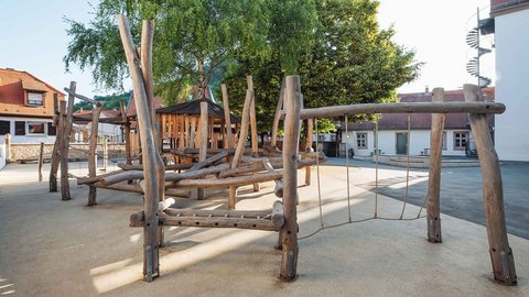 Der Schulhof der Schlossschule Heppenheim liegt umschlossen vom denkmalgeschützten Schulgebäude, eingebettet in der Heppenheimer Altstadt mit fantastischem Blick auf in die umgebenden Weinberge.