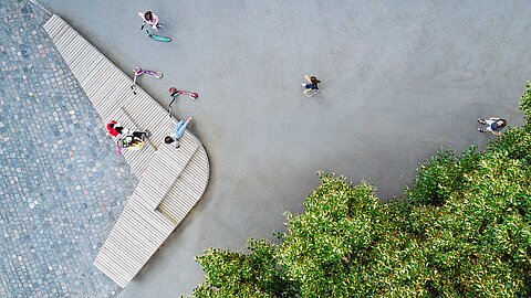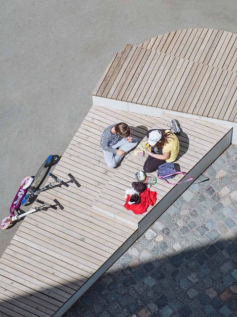 Der Dreh- und Angelpunkt des Hofes ist eine zentrale Freifläche, die vielfältig nutzbar ist und Raum für Bewegung schafft. Die Formgebung leitet optisch zu den einzelnen Bereichen hin. Durch Belagswechsel einerseits und Sitz- und Liegeplateaus andererseits wird die zentrale Bewegungszone von der Ruhezone getrennt. Die Sitz- und Liegeplateaus laden zum Ausruhen, Klettern, Spielen ein, sie trennen auch räumlich die Nachmittagsbetreuung vom Schulhof. An der westlichen Hofmauer ist eine Spiel- und Kletterlandschaft angeordnet, die neben einem Baumhaus verschiedene Kletter-, Hangel- und Balanciermöglichkeiten bietet und so ein breites Bewegungsspektrum ermöglicht. Dieses wird noch erweitert durch ein Fußballfeld und Tischtennisplatten.