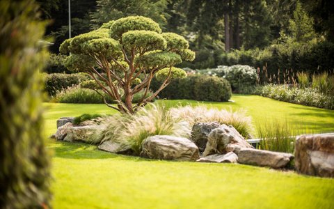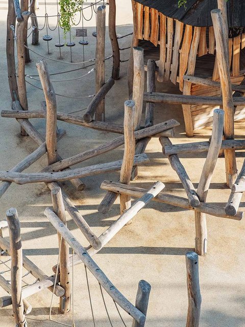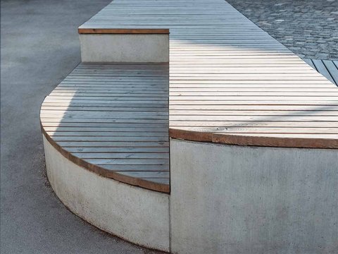 Bei der Zusammenstellung der Materialien wurde auf natürliche Farben gesetzt, um dem dicht gefüllten Raum eine gestalterische Ruhe zu verleihen und sich mit den umgebenden Gebäuden und der Landschaft zu verbinden. Ein besonderes Augenmerk lag auf dem Erhalt der zwei großen Bäume, die dem gesamten Hof Atmen lassen.